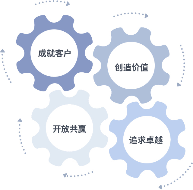 成就客户是一切决策的出发点,,,,创造价值是衡量所有工作的标准,,追求卓越是尊龙凯发做事做人的态度,,,开放共赢是尊龙凯发的格局也是最终的结果。。。。价值观的齿轮环环相扣,,推动着组织里的每个人不断向前。。